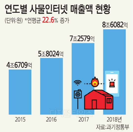 이번 조사에 따르면, 국내 사물인터넷 매출액(8조 6082억원)은 2017년(7조 2579억원) 대비 18.6% 증가한 것으로 나타났다. 최근 들어 연평균(2015~2018년) 22.6% 성장한 기록이다.