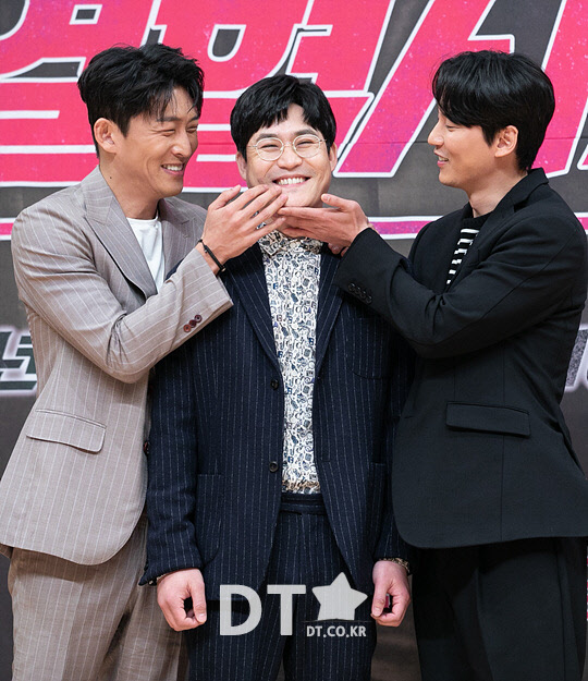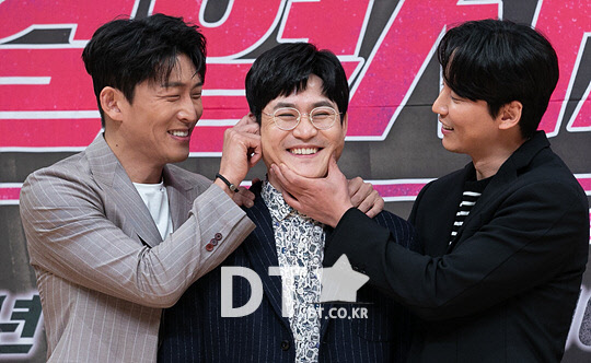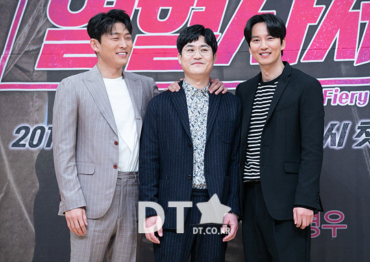 배우 고준(왼쪽부터), 김성균, 김남길이 15일 서울 양천구 목동 SBS에서 열린 금토 드라마 '열혈사제' 제작발표회에서 포즈를 취하고 있다.