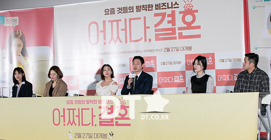 18일 서울 CGV 용산아이파크몰에서 열린 영화 '어쩌다, 결혼' 언론시사회에 참석한 출연진이 질문에 답하고 있다.
