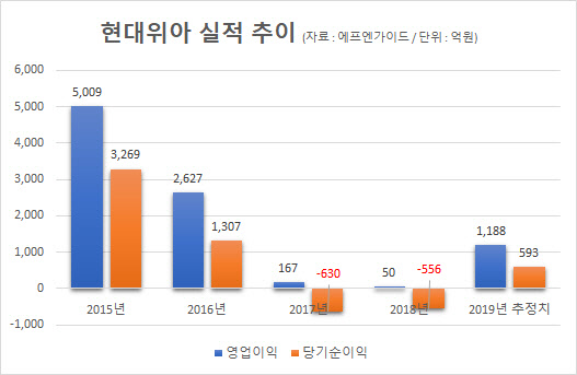 현대위아의 '깜짝 발표'는 올해 실적 정상화 기대에 더욱 힘을 실었다. 현대위아는 지난 2017년 적자로 돌아선 이후 주가도 날개 없는 추락을 이어갔다. 작년 현대위아는 556억원을 당기손실을 기록하며 2년 연속 적자를 냈다. 영업이익은 50억원으로 전년 대비 무려 70% 급감했다.