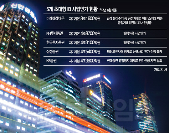 하지만 발행어음 인가를 받는 일 자체가 쉽지 않다. 현재 초대형 IB로 지정된 5개사 중 발행 어음 인가를 받은 곳은 한국·NH투자증권 2곳에 불과하다. 미래에셋대우의 경우 공정거래위원회가 일감 몰아주기 의혹 조사를 하면서 발행어음 인가 심사가 무기한 연장됐다. KB증권은 옛 현대증권 시절 59조원 불법자전거래에 대한 징계로 인가를 받지 못했고 최근 재신청을 준비했지만 직원 횡령 사건으로 인가 신청이 미뤄졌다. 삼성증권은 작년 '유령주식 배당사고'를 일으키며 공격적인 사업에 나서지 못했다. 인가 지연에 국내 초대형 IB들은 무기 없이 시장에 선 셈이 됐다. 업계 관계자는 "업을 열어주지 않으면 공격적인 투자도 어렵다"고 말했다.