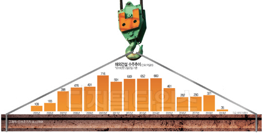 지난 2014년만 하더라도 660억 달러 규모였던 해외건설 수주액은 2015년 들어 461억 달러로 급감한데 이어 2016년에는 282억 달러까지 떨어졌다.