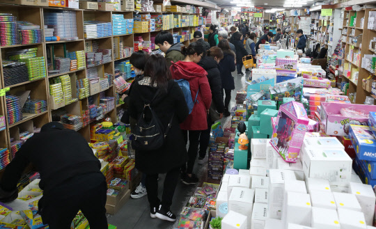 신학기를 앞둔 3일 서울 종로구 창신동 문구완구거리에 있는 문구도매점이 신학기 용품을 사려는 시민들로 붐비고 있다.