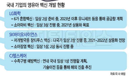 11일 제약·바이오 업계에 따르면 LG화학, SK바이오사이언스, CJ헬스케어 등 국내 주요 제약, 바이오 기업들이 소아마비, 장티푸스, 수족구병 등을 예방하는 영유아 백신 시장 공략을 본격화하고 있다.