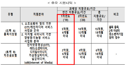 품목지정공모 과제는 '소프트웨어 기반의 OTT(인터넷동영상 서비스) 개발'과 '디지털사이니지 기반의 양방향·지능형 서비스 개발' 분야이며, 2개 이상의 중소·벤처기업의 참여가 필수이다. 이 외 자유공모 과제는 인터넷동영상, 개인·소셜미디어, 디지털사이니지, IoM(Internet of Media), 가상현실미디어, 실감미디어 등 스마트미디어 6개 분야에 대해서 연간 최대 2억원을 기술개발 사업화에 지원할 계획이다.
