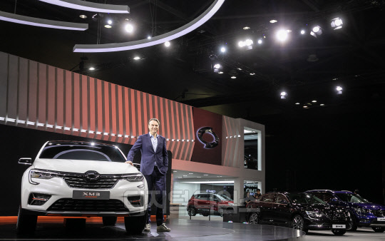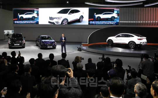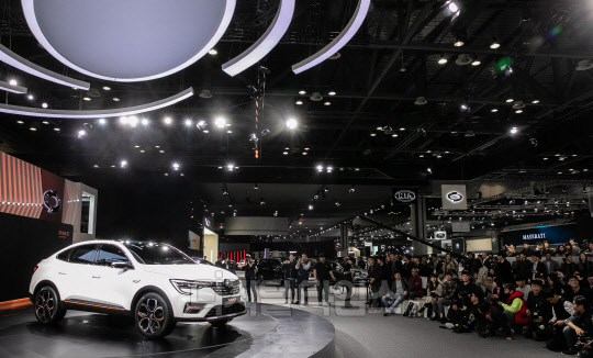 28일 경기도 고양 킨텍스에서 2019 서울모터쇼 미디어 공개 행사가 열렸다. 이날 르노삼성 자동차 부스에서 XM3 인스파이어 등 신형 차량을 선보이고 있다.