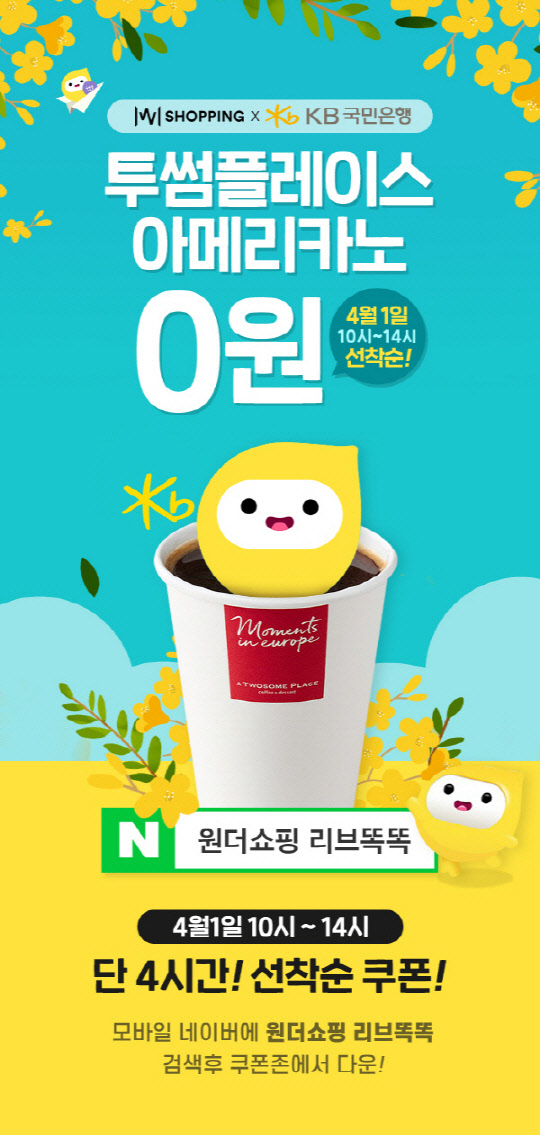 원더쇼핑이 KB국민은행 뱅킹앱 '리브똑똑'과 함께 투썸플레이스 아메리카노 0원 이벤트를 실시한다고 29일 밝혔다.