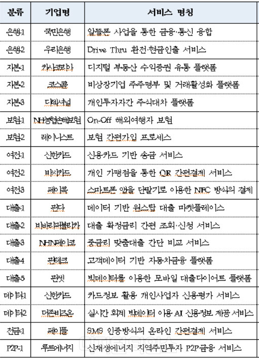 은행에서는 국민은행과 우리은행이 각각 알뜰폰 사업을 통한 금융·통신 융합, Drive Thru 환전·현금인출 서비스를 심사 대상으로 신청했다.