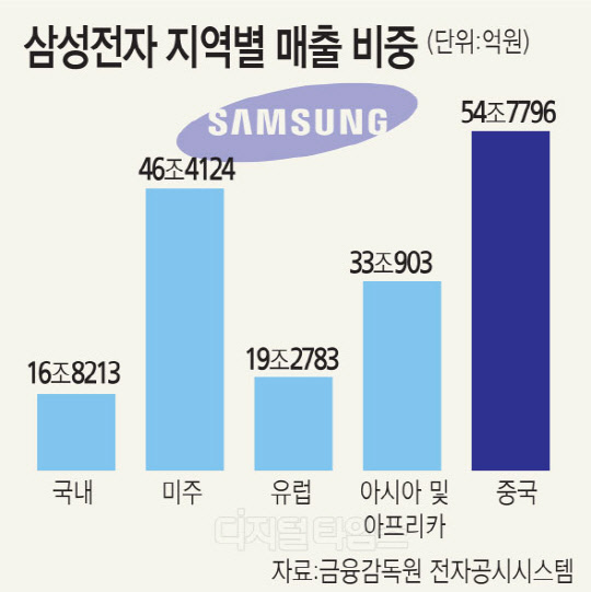 8일 업계에 따르면 삼성전자의 지난해 대 중국 매출(별도 기준)은 54조7796억원으로 전체의 32.2%를 기록했다. 이는 지역별 매출을 공시한 지난 2012년(20.4%) 이후 가장 높은 비율이다.