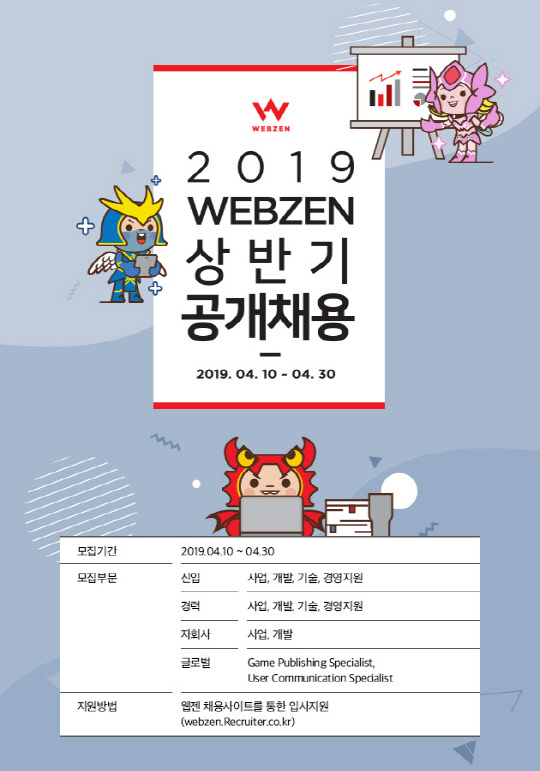 웹젠의 이번 상반기 공개채용에서는 사업과 게임개발·기술지원·경영지원 부문의 10여개 직무에서 신입사원을, 같은 부문 20여개 직무에서는 경력사원을 각각 모집한다. 경력사원 모집부문에서는 자회사들의 공개채용도 함께 진행되며, 글로벌 사업부문에서는 영어, 프랑스어 등 모국어 구사인원을 채용한다.