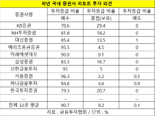 금융투자협회 전자공시서비스에 따르면 작년 '검은 10월' 등 롤러코스터 장세속에서도 국내 증권사 32곳의 매수 의견 리포트 비중은 90.7%에 달했다. 중립(보유) 의견 리포트 비중은 9.2%였다. 반면 매도 의견 리포트 비중은 0.1%에 그쳤다. 매도 의견을 내놓은 증권사는 대신증권, 키움증권, 하나금융투자 3곳에 불과했다.