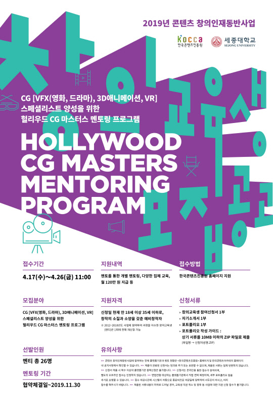 모집 분야는 CG 분야 중 VFX(영화, 드라마), 3D애니메이션, VR 이며, 선발 인원은 정확히 26명의 멘티를 모집한다.