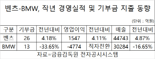 메르세데스-벤츠코리아와 BMW코리아가 작년 내놓은 기부금이다. 벤츠코리아는 작년 국내에서 7만798대 차량을 판매하며 또다시 최다 판매 기록을 갈아치우며 경영실적 역시 성장세를 이어갔다. 반면 BMW코리아는 주행 중 잇단 화재에 휘말리며 4774억원이라는 적자를 떠안으며 부진했다.