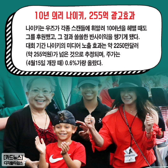 나이키는 우즈가 각종 스캔들에 휘말려 10여년을 헤맬 때도 그를 후원했고, 그 결과 쏠쏠한 반사이익을 챙기게 됐다. 대회 기간 나이키의 미디어 노출 효과는 약 2250만달러(약 255억원)가 넘은 것으로 추정되며, 주가는 (4월15일 개장 때) 0.6%가량 올랐다.