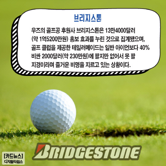 우즈의 골프공 후원사 브리지스톤은 13만4000달러(약 1억5200만원) 홍보 효과를 누린 것으로 집계됐으며, 골프 클럽을 제공한 테일러메이드는 일반 아이언보다 40% 비싼 2000달러(약 230만원)에 팔지만 없어서 못 팔 지경이라며 즐거운 비명을 지르고 있는 상황이다.