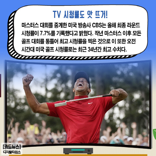 마스터스 대회를 중계한 미국 방송사 CBS는 올해 최종 라운드 시청률이 7.7%를 기록했다고 밝혔다. 작년 마스터스 이후 모든 골프 대회를 통틀어 최고 시청률을 찍은 것으로 이 또한 오전 시간대 미국 골프 시청률로는 최근 34년간 최고 수치다.