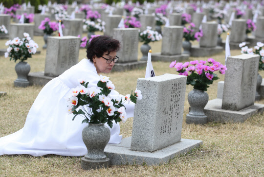 4·19혁명 59주년을 하루 앞두 18일 오전 서울 강북구 국립4·19민주묘지에서 이현규씨가 남편 김세중씨의 묘비를 어루만지고 있다.