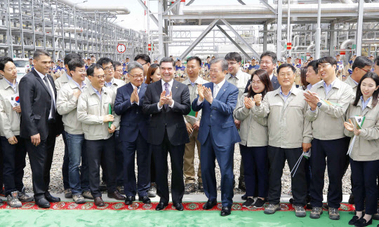 문재인 대통령과 베르디무하메도프 대통령이 18일 오전(현지시간) 키얀리 가스화학플랜트를 방문해 근로자들과 함께 기념 촬영한 후 박수치고 있다. 한국기업들이 주도적으로 건설한 투르크멘바시 키얀리 가스화학 플랜트는 잠실종합운동장의 3배 규모로 중앙아시아 최대이자 투르크메니스탄 최초의 가스화학 플랜트이다.