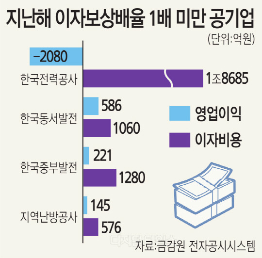 24일 금융감독원 전자공시시스템에 따르면 지난해 사업보고서와 감사보고서를 제출한 공기업 12곳 중 4곳이 이자보상배율 1배를 밑돌았다. 여기에는 한국전력, 한국동서발전, 한국중부발전, 지역난방공사 등이 포함됐다. 이자보상배율이란 영업이익에서 이자비용을 나눈 값으로 이자 상환 능력을 뜻한다. 이자보상배율 1배 미만은 사실상 이자를 갚기도 어렵다는 의미로 해석된다.