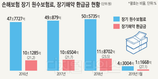 손해보험도 장기해약 환급금 비율이 상승하고 있다. 2017년에 전체 장기 원수보험료 49조원 중 21.7%(10조7000억원)가 장기해약 환급금으로 나갔다. 작년에는 전체 장기 원수보험료가 50조6000억원으로 늘어났으나 장기해약 환급금도 11조9000억원으로 증가하면서 비율이 23.5%로 높아졌다. 올해 1월까지는 장기 원수보험료 4조3000억원 중 27.1%인 1조2000억원이 해약 환급됐다.