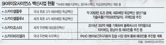 SK는 백신 사업의 전문성을 높이기 위해 지난해 7월 SK케미칼에서 분할해 백신 전문기업 SK바이오사이언스를 설립했다. 이 신설 회사는 '세계 최초', '국내 최초'라는 타이틀을 가진 자체개발 백신을 보유하고 있다. 특히 이들 백신은 국내에서의 빠른 성장세와 글로벌 기술 수출 등을 바탕으로 백신 시장에서 입지를 굳혀 나가고 있다.