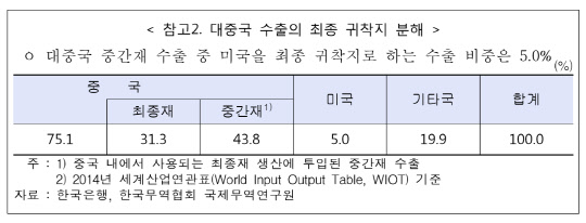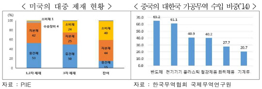 한국의 미국·중국에 대한 수출비중(38.9%)은 대만 다음으로 높다. 미국의 대중국 무역제재에 따른 연쇄 효과로 대중(對中) 수출에서 중간재 비중이 큰 대만, 한국, 일본, 독일 등 국가들이 큰 수출 피해를 볼 것으로 예상된다. 한국의 대 중국 수출에서 중간재 비중은 79.0%나 된다.