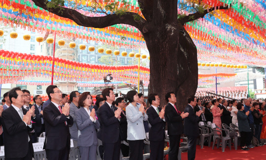 불기 2563년 부처님오신날인 12일 오전 서울 종로구 조계사에서 열린 봉축법요식에서 더불어민주당 이해찬 대표(앞줄 오른쪽부터), 바른미래당 손학규 대표, 민주평화당 정동영 대표, 정의당 이정미 대표, 더불어민주당 이인영 원내대표, 자유한국당 나경원 원내대표 등이 합장하고 있다.