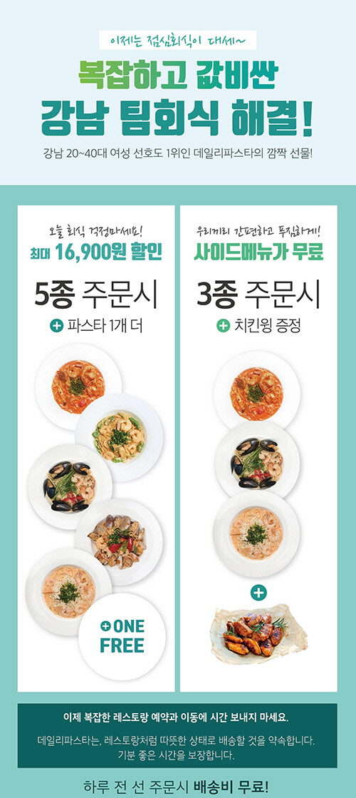 강남파스타 맛집 데일리파스타 관계자는 앞으로도 직장인들의 워라벨 문화에 맞춰 다양한 점심주문 이벤트를 실시할 예정이라고 설명했다.