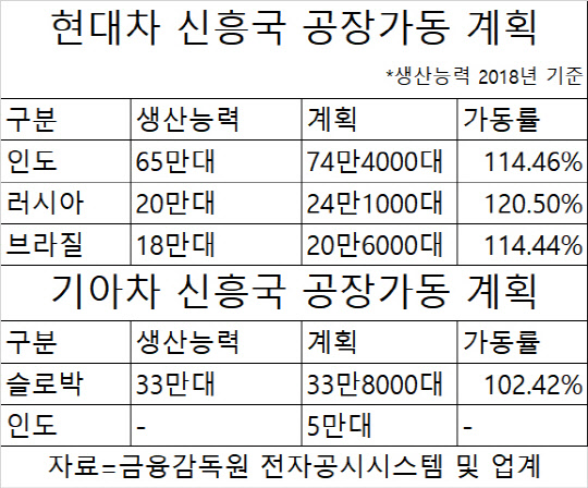 현대차는 러시아와 브라질공장 가동률도 100% 넘게 끌어올릴 계획이다. 연간 20만대 생산능력을 갖춘 러시아공장에서는 24만 여대를, 18만대를 생산할 수 있는 브라질공장에서는 20만여 대를 생산한다. 목표 가동률로만 따지만 러시아가 120.5%로, 가장 높을 가동률을 기록할 것으로 추산된다.