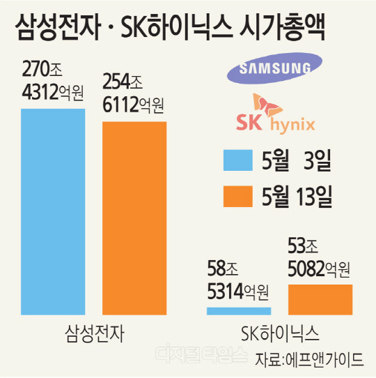14일 금융정보업체 에프앤가이드에 따르면 코스피가 본격 하락세를 나타내기 시작한 지난 3일부터 전일 종가까지 삼성전자 시총은 15조8199억원 감소했다. 이는 전체 코스피 상장사 중 감소 폭이 가장 크다. 이어 SK하이닉스 시총은 5조232억원 줄었다. 이들 종목의 시총은 총 20조8431억원 급감했다.