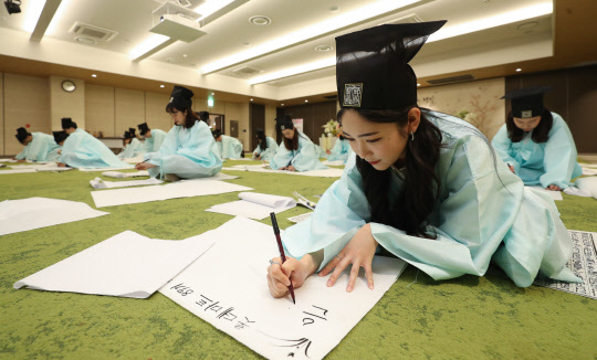 23일 서울 영등포구 빅마켓 영등포점 롯데 리테일 아카데미에서 열린 롯데마트 신입사원 100일 기념 백일장에서 지난 2월 8일 입사한 롯데마트 신입사원들이 붓글씨를 쓰고 있다.