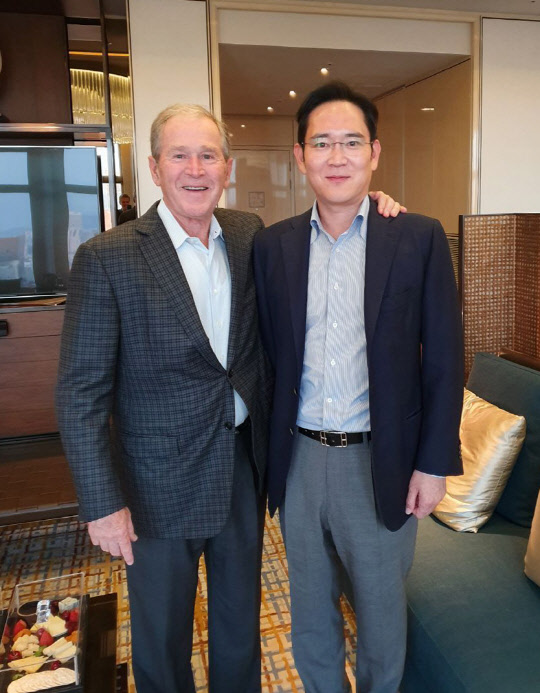 이재용 삼성전자 부회장(오른쪽)이 지난 22일 오후 서울의 한 호텔에서 조지 W. 부시 전 미국 대통령과 면담 후 기념촬영을 하고 있다. 두 사람의 회동은 지난 2015년 10월 부시 전 대통령이 '프레지던츠컵 대회' 개막식 참석차 방한했을 때 환담한 이후 4년 만이다.