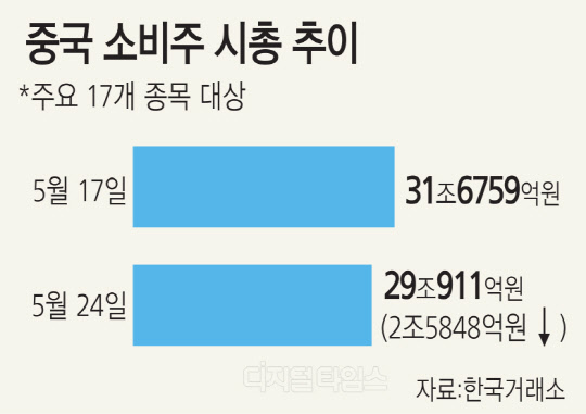 이 가운데 토니모리(-19.83%), 에이블씨엔씨(-9.46%), 아모레퍼시픽(-9.37%), 한국화장품제조(-8.98%) 등 화장품 관련 종목의 주가가 가장 많이 하락했다. 또 'MLB' 브랜드로 중국 시장에서 급성장 중인 패션의류업체 F&F 주가도 14.53% 급락했다.