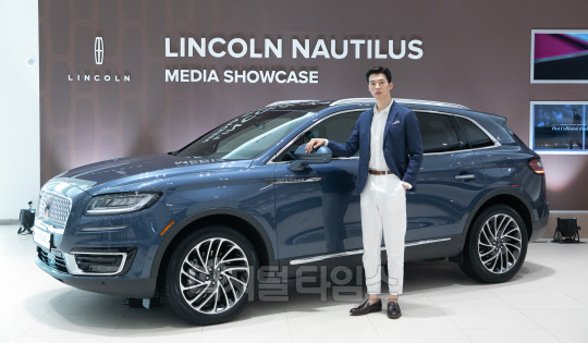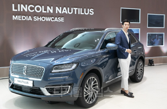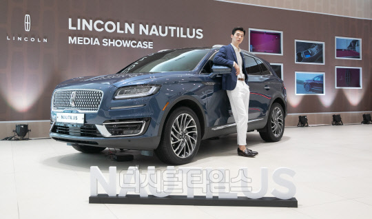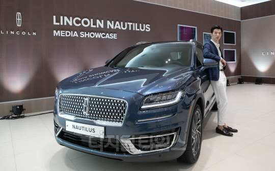 링컨코리아가 28일 서울 강남구 대치전시장에서 미디어 쇼케이스를 열고 준대형 SUV 노틸러스를 공개했다. 모델이 차량과 함께 포즈를 취하고 있다.