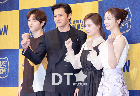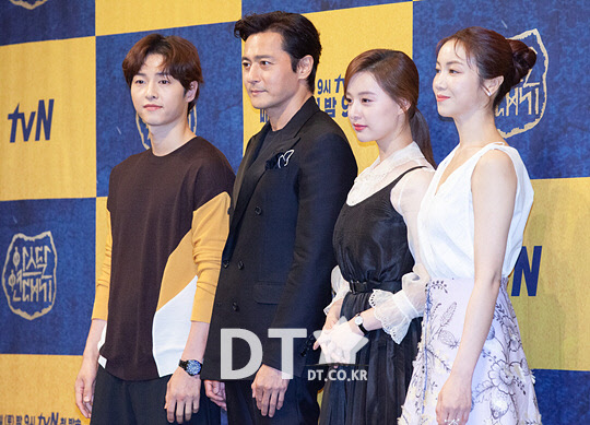 배우 송중기, 장동건, 김지원, 김옥빈이 28일 강남구 임피리얼 팰리스 서울 호텔에서 열린 tvN 주말 드라마 '아스달 연대기' 제작발표회에서 포즈를 취하고 있다.