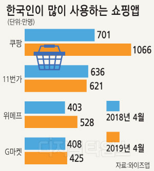 30대는 쿠팡, 위메프, 11번가, 티몬, 40대는 쿠팡, 11번가, 위메프, G마켓 순이었다. 50대 이상은 쿠팡, 11번가, 홈앤쇼핑, G마켓의 순으로 이용했다.