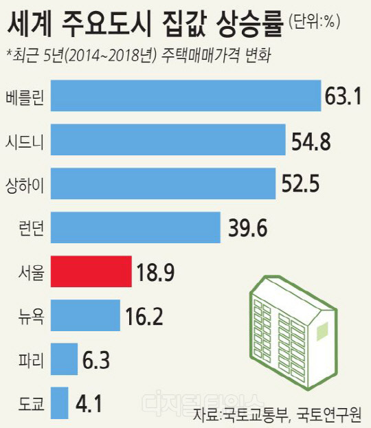 [디지털타임스 박상길 기자] 최근 5년간 서울 집값 상승률은 18.9%로 런던과 베를린, 시드니, 상하이 등 세계 주요 도시에 비해 상대적으로 안정된 것으로 나타났다.