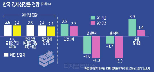 앞서 KDI와 금융연구원, OECD(경제협력개발기구)가 성장률 전망치를 2.6%에서 2.4%로 낮췄으며, 한국은행(2.5%)도 다음 달 하향 조정할 것이란 관측이 나온다.
