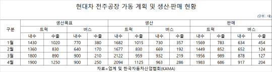 ◇현대차, 가동률 '100%'에도 못 웃는 사연 = 11일 본지가 입수한 자료와 한국자동차산업협회(KAMA) 등에 따르면 현대차는 올 들어 4월까지 올해 전주공장 생산 목표로 잡은 목표치 100%를 웃돈 것으로 집계됐다. 전주공장에서는 트럭과 버스가 생산된다.