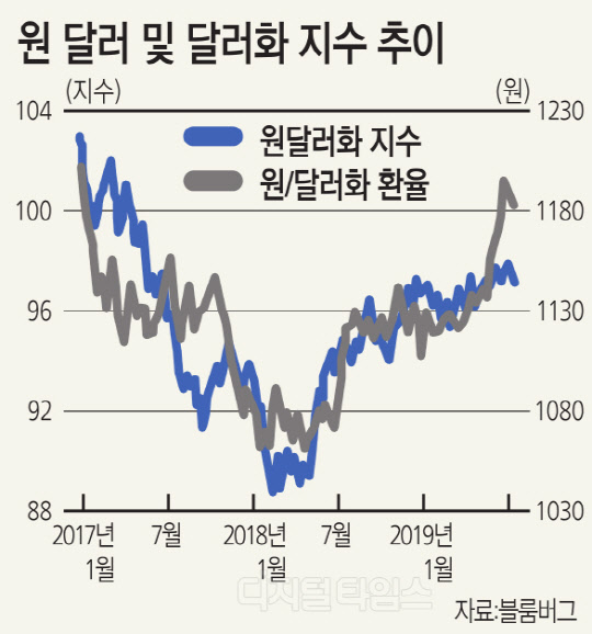 달러화는 트럼프의 멕시코 관세 부과와 연준 파월 의장의 비둘기파적 발언에 따른 금리인하 기대 증가, 미국 경제지표 부진으로 하락세를 보이고 있다. 5월 미국 공급자관리협회(ISM) 제조업 지수는 2016년 10월 이래 가장 낮은 수치를 기록하기도 했다.