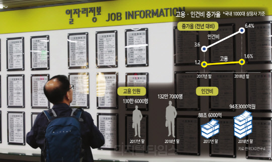 실제로 지난해 1000대 상장기업의 인건비 증가액(5조6487억원)은 연봉 5000만 원을 받는 직원을 11만2000명 정도 고용할 수 있는 규모이지만 실제 고용은 2만1000명 늘어나는 데 그쳤다.
