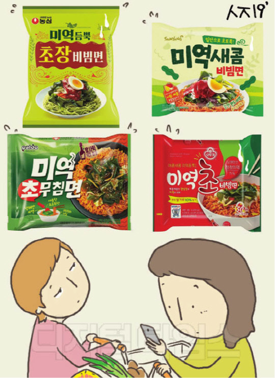 가장 먼저 농심이 지난 3월 '미역듬뿍 초장비빔면'을 출시했고 팔도와 오뚜기, 삼양식품이 각각 미역초무침면, 미역초 비빔면, 미역새콤비빔면을 선보였다.