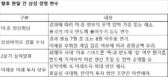 ◇무역전쟁에 검찰 수사까지…'고난의 길'= 삼성은 현재 극에 달한 대내·외 불확실성으로 경영 예측조차 쉽지 않은 상황이다. 당장 오는 28일 일본 오사카에서 개막하는 G20 정상회의에서의 미·중 간 정상회담의 결과가 큰 변수다.