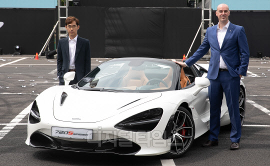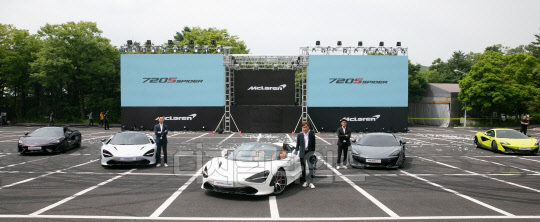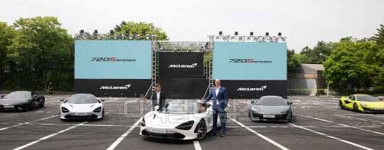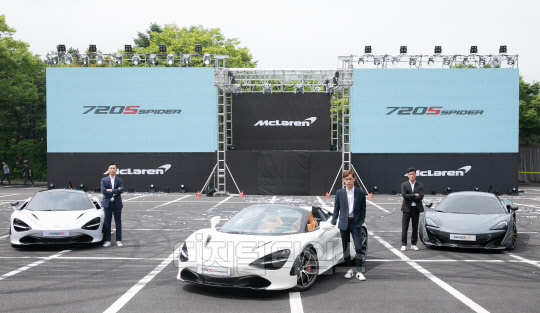 고성능 슈퍼카 브랜드 맥라렌이 20일 경기 과천 서울랜드 후문 주차장에서 강력한 퍼포먼스와 오픈 에어링을 결합한 702S 스파이더 공식 출시 행사를 가졌다. 이날 행사에 참석한 모델들과 롭 프리차드 맥라렌 아시아탱평양 총괄이 맥라렌 720S 스파이더와 함께 포즈를 취하고 있다.
