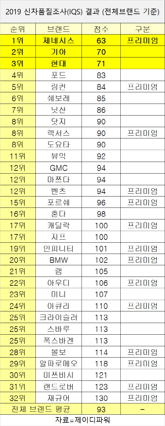 제이디파워 IQS는 1987년부터 시작한 품질조사다. 올해는 고급브랜드 14개, 일반브랜드 18개 등 모두 32개 브랜드, 257개 차종을 대상으로 조사를 실시했다. 작년 11월부터 올해 2월까지 미국에서 판매한 신차의 사용 3개월간 소비자 경험으로 233개 항목에 대한 품질 불만 사례를 집계한다. 100대당 불만 건수를 점수로 나타내며, 점수가 낮을수록 품질만족도가 높음을 의미한다.