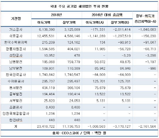 장부가액이란 지분의 현재 가치다. 취득가액보다 장부가액이 더 줄었다는 것은 그만큼 회사 가치가 떨어져 손해를 봤다는 의미다. 이 기간 공기업의 해외법인들은 취득가액과 장부가액의 차이인 2조1616억원의 혈세를 허공에 날린 셈이다.
