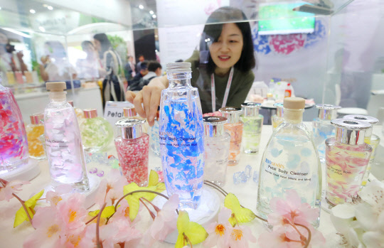 26일 오후 서울 강남구 코엑스에서 열린 '2019 인코스메틱스 코리아' 전시부스 관계자가 전시물을 보고 있다.