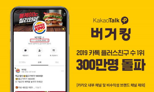 버거킹 카톡 플친은 지난 12월 브랜드 채널 플친 수 순위 1위에 등극한 후 꾸준히 증가하여 300만명을 돌파하며 6개월 째 1위 자리를 고수 중이다. 버거킹의 카톡 플친 채널 친구 수는 6월 26일 현재 3,008,896명으로, 카카오 내부 채널 및 비수익성 브랜드 채널을 제외한 계정 중 가장 먼저 300만명을 넘어섰다.