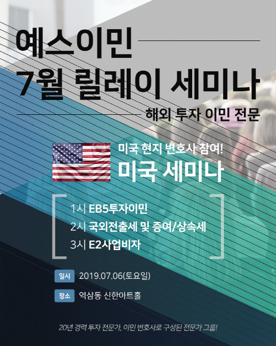 ㈜예스이민법인에서 7월 6일 토요일 오후 1시부터 미국 투자이민 EB5, 국외 전출세 및 증여 상속세 3시 E2 사업 비자 세미나를 역삼 신한은행 아트홀에서 개최된다. 세미나 참석을 위해서는 해당 이주업체의 홈페이지나 전화를 통해서 사전 예약을 하면 무료입장이 가능하다.