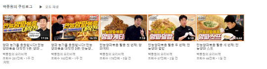 가장 많은 조회수를 기록한 영상은 '이것이 업소 스케일! 백종원의 대용량 레시피 첫 번째, 제육볶음 100인분 만들기'다. 이 영상은 422만회 이상 조회됐다.